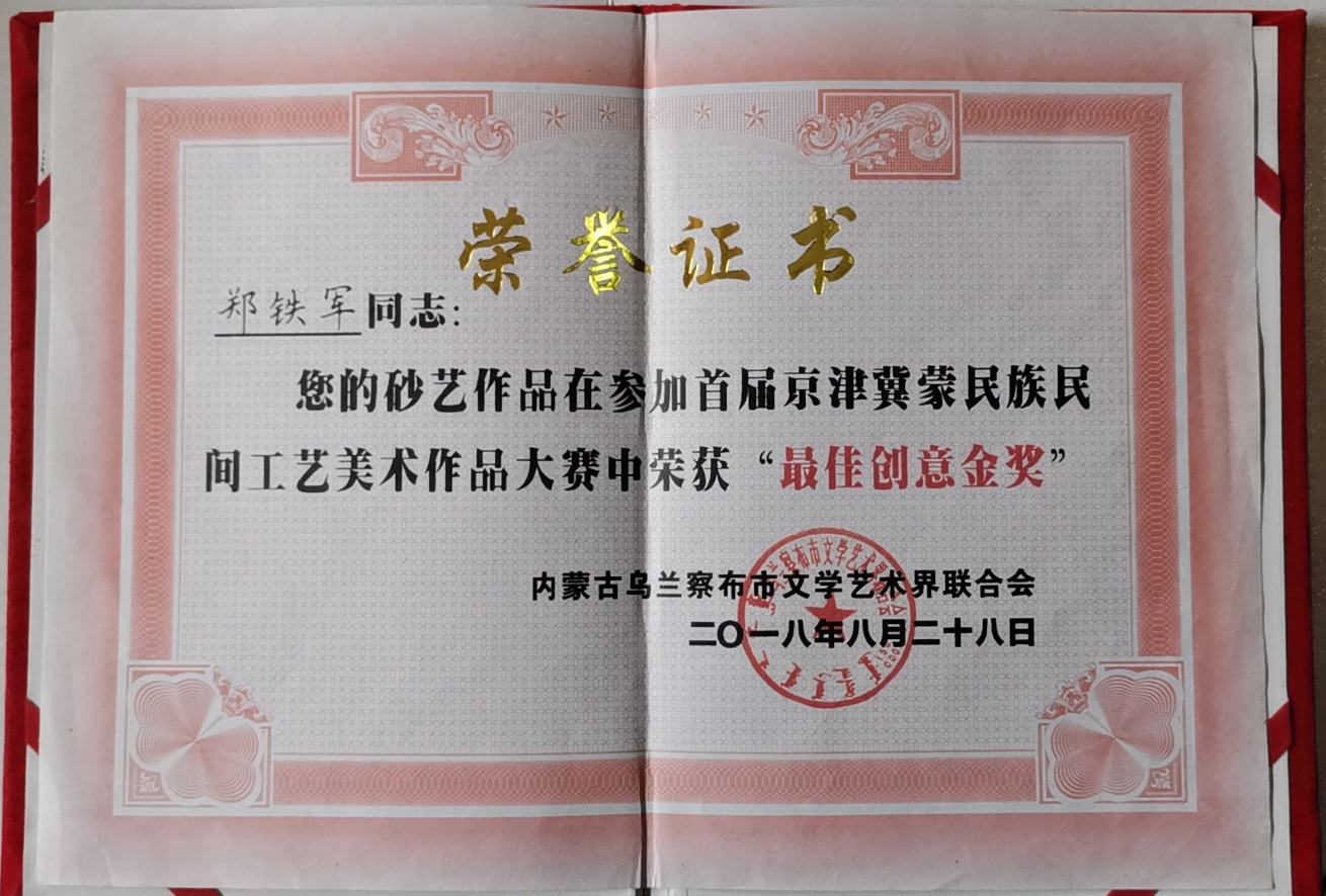 二〇一八年八月十七日至二十一日,烏蘭察布市首屆京津冀蒙民族民間藝術(shù)博覽會(huì)在內(nèi)蒙古自治區(qū)烏蘭察布市開幕。興隆縣鄭氏砂藝(畫)以承德市唯一一家省級(jí)非遺民間藝術(shù)產(chǎn)品出席開幕式并參展。在活動(dòng)中鄭氏砂畫藝術(shù)品受到社會(huì)各界人士一致好評(píng),并榮獲首屆京津冀蒙民族民間工藝美術(shù)作品大賽“最佳創(chuàng)意金獎(jiǎng)”。